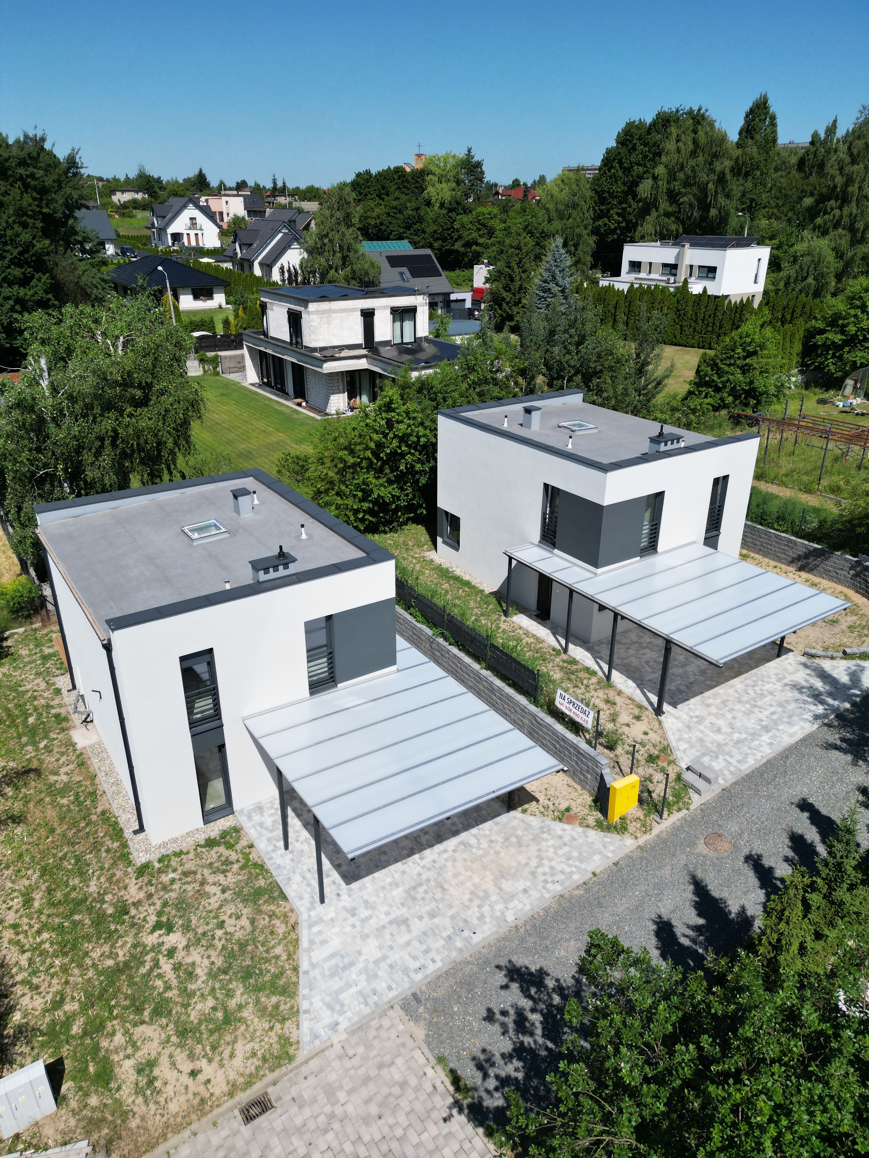 Każdy dom posiada 2 miejsca postojowe na zewnątrz, łącznie 4 miejsca dla całej inwestycji.